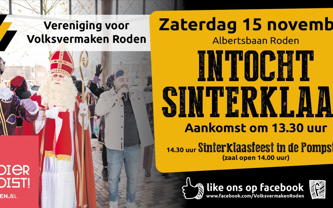 Zaterdag 15 november komt Sinterklaas en zijn pieten weer aan in Nederland. Na de landelijke intocht gaan ze direct door naar Roden om er daar met alle kinderen, een fantastische dag van te maken.
